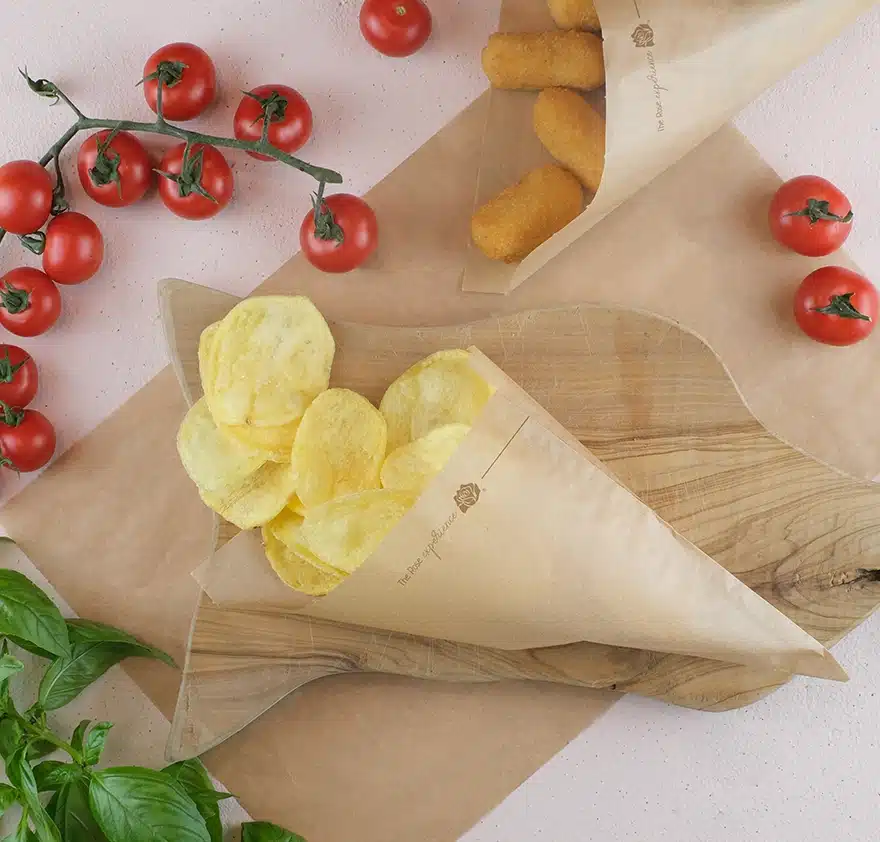Les frites et tous les autres aliments frits contenus dans ces cornets restent croustillants et délicieux, comme s’ils venaient d’être cuits, tandis que le grammage du papier protège les mains de la température élevée des aliments.
